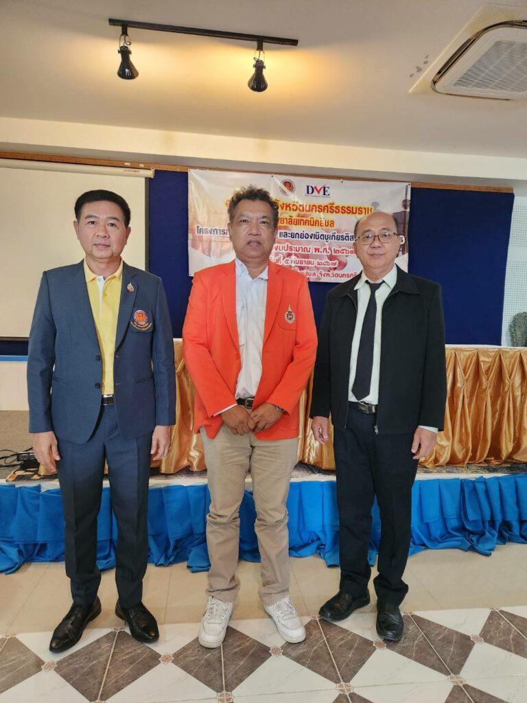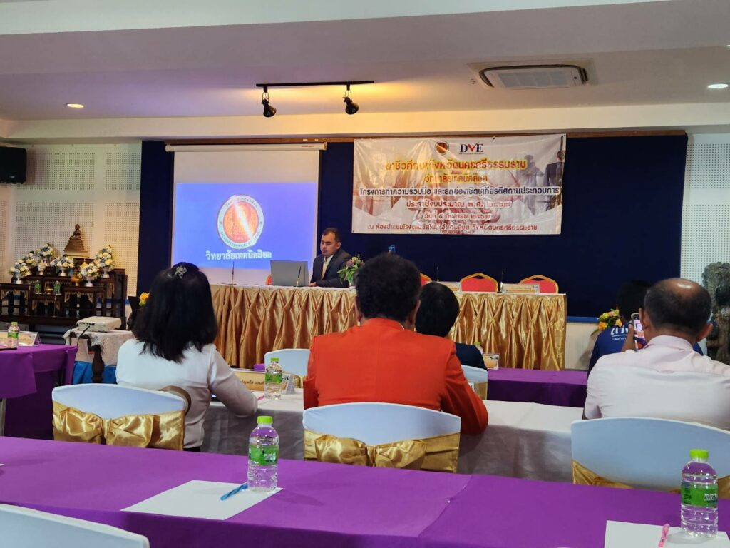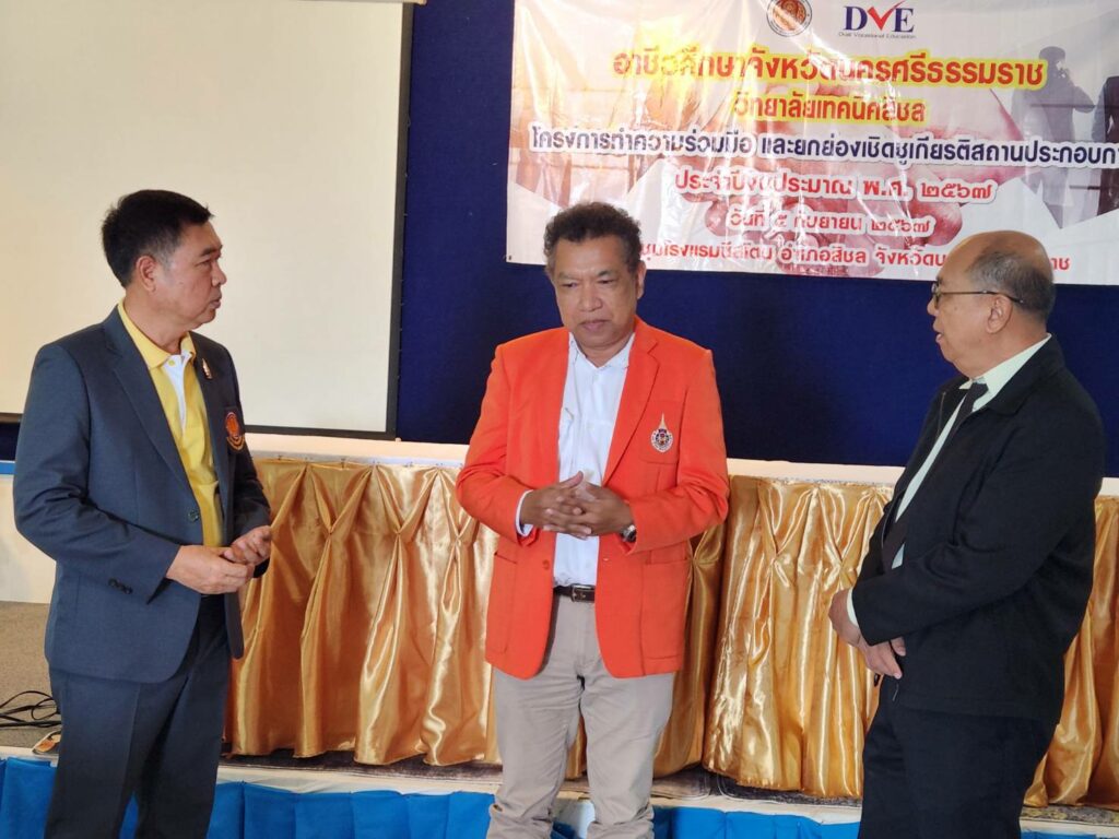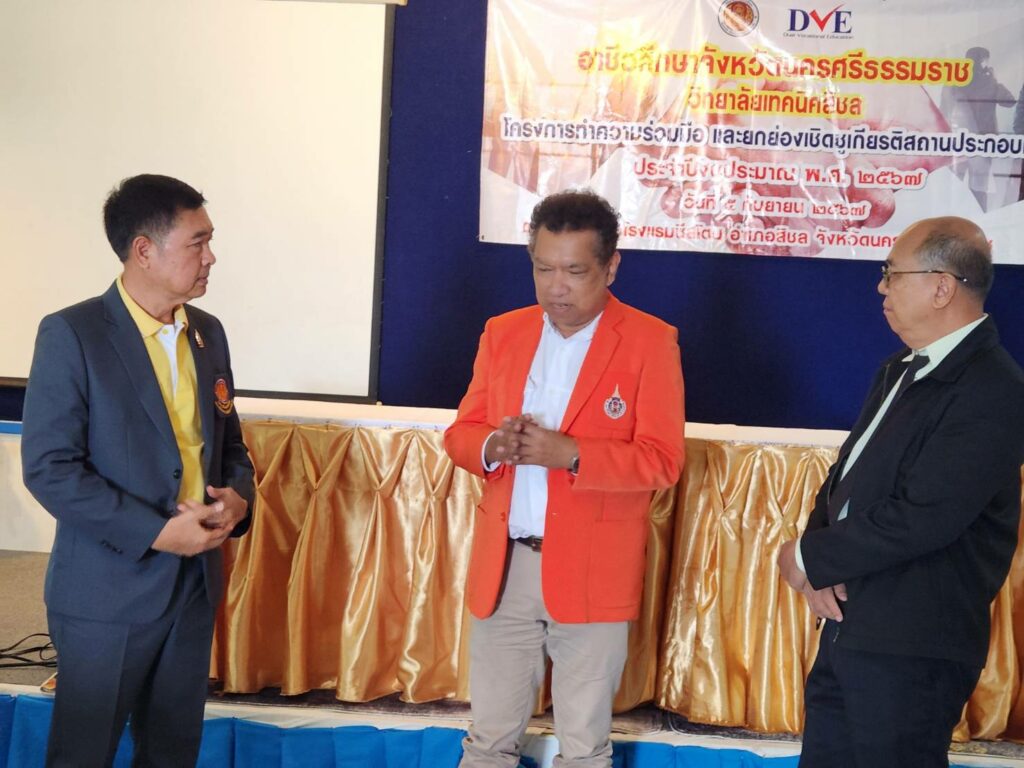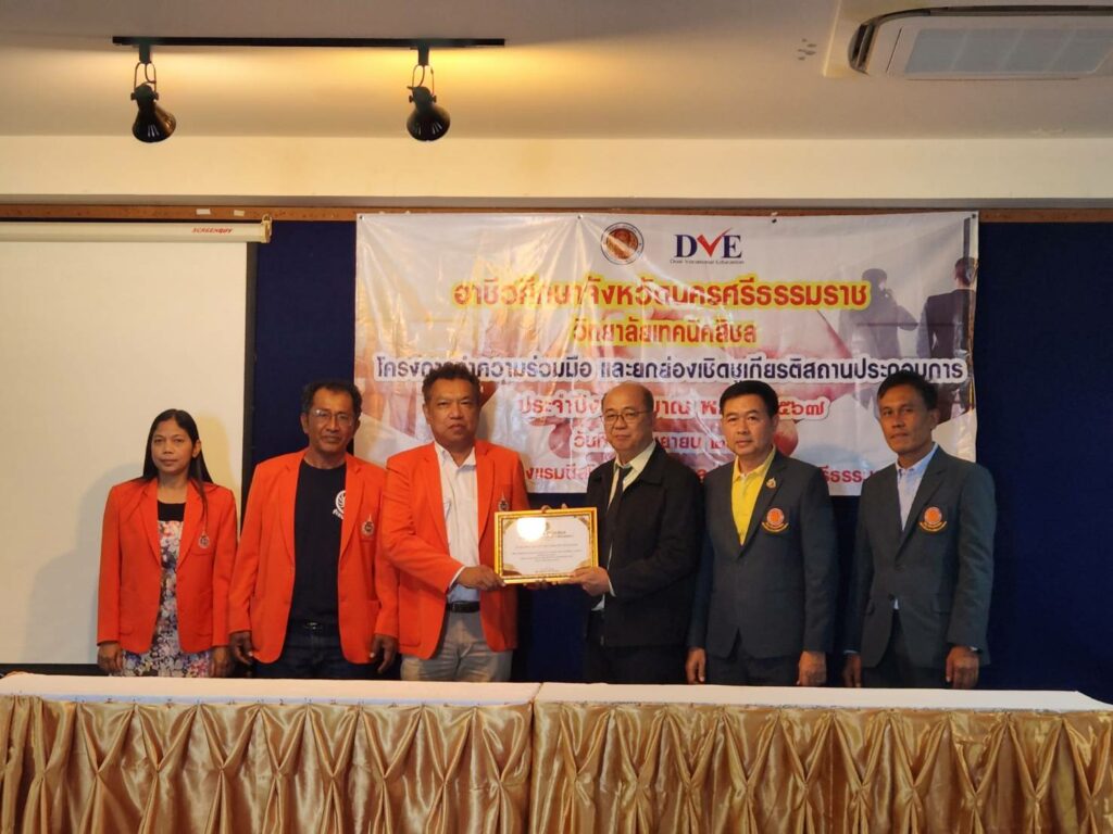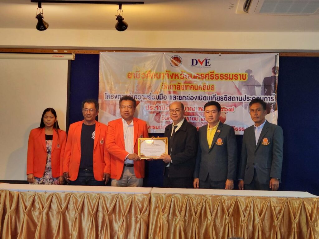 In this regard, Mr. Manas Churasri, Director of Sichon Technical College, gave a report and introduced the college, which offers vocational certificate (Vocational Certificate) and higher vocational certificate (Vocational Certificate) programs, in which 9 subjects are taught. The project was organized to cooperate and honor outstanding business establishments, totaling 16 establishments, to thank entrepreneurs and vocational training centers for being a part in enhancing students’ professional skills and experiences, as well as creating a good network.